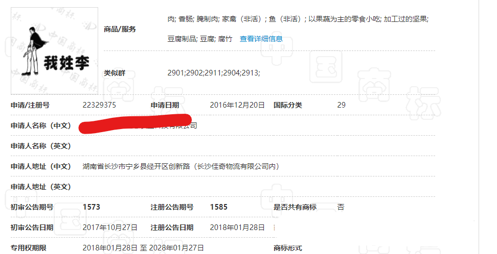 2016年,马上又跟上来一个“我姓李”商标,这个“我姓李”可不单单只是文字,人家还带有图形,同样让人看了后,过目不忘。