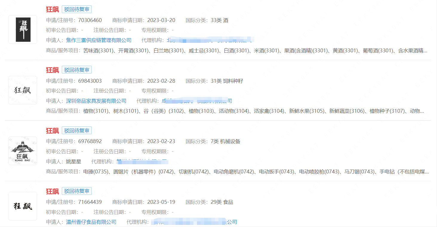 例如:剧名《狂飙》,不过很多都没有注册成功,可能商标局也知道这是蹭热点的抢注行为。