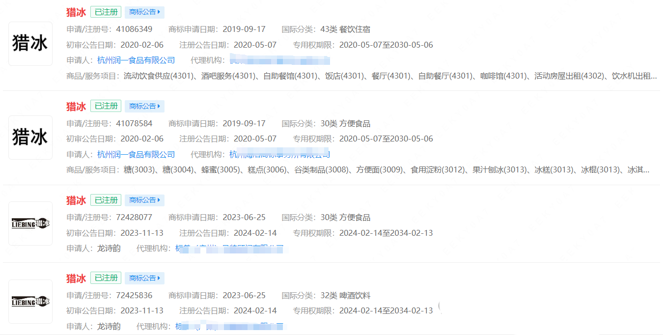 电视剧《猎冰》剧名前面就有人注册过商标,但这应该不是抢注,因为注册的时间都比较早了,也都注册成功了。