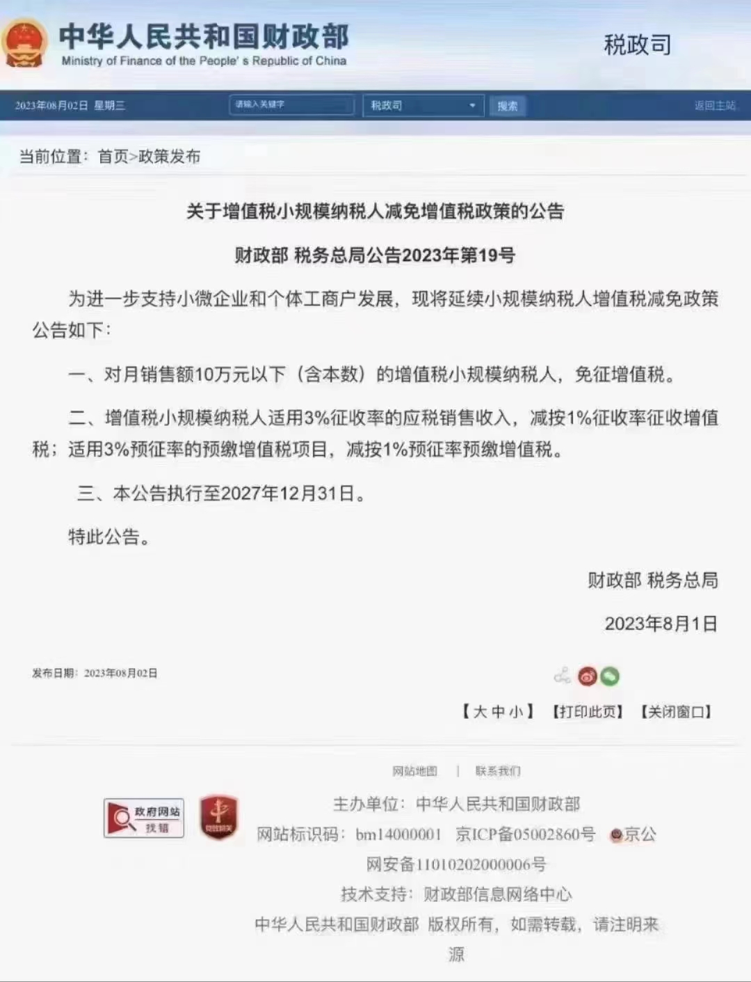 1、小规模纳税人月销售额低于10万元(季度30万)免征增值税;