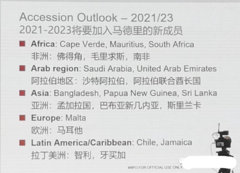 根据WIPO的展望,包括沙特等中东国家在内的多个国家,将陆续于2021-2023年加入马德里体系,