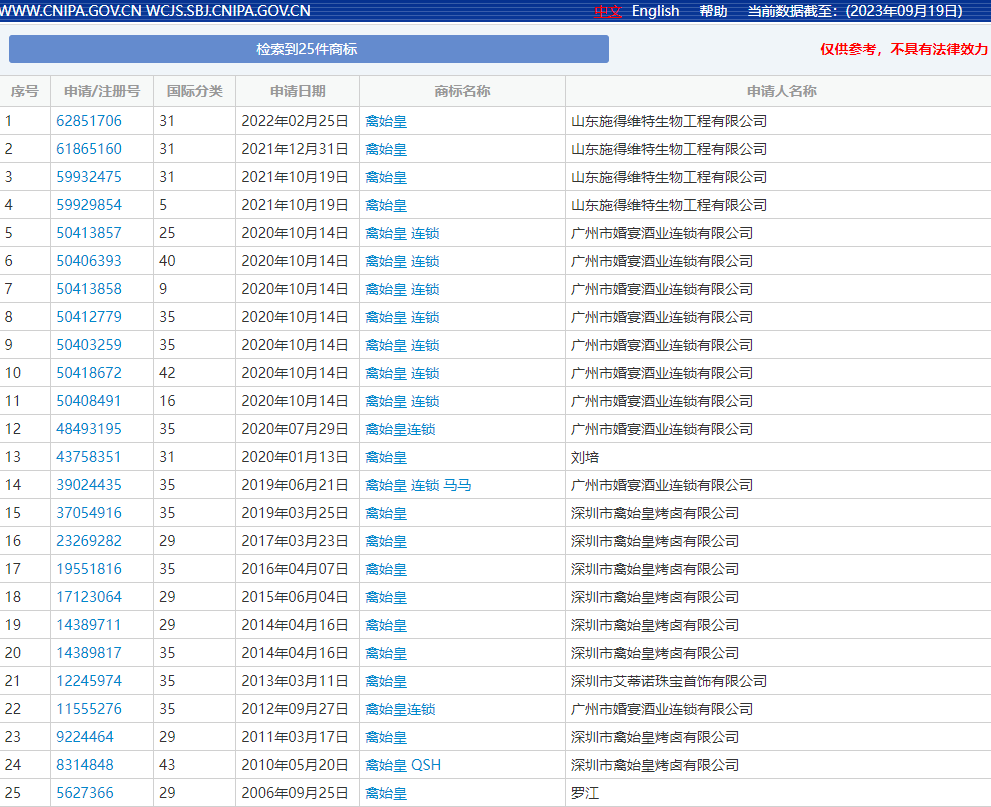 据悉,深圳市禽始皇烤卤有限公司自2010年就开始申请“禽始皇QSH”图形商标,2014年又申请了多件“禽始皇”、“禽始王”等商标,