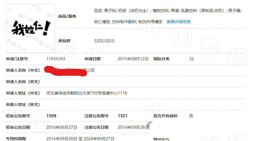 2015年,就有一家公司在豆浆、奶茶等产品上申请了“我姓仁!”商标。