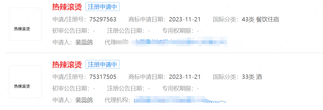 另外通过企查查显示,“热辣滚烫”的商标被多方注册。