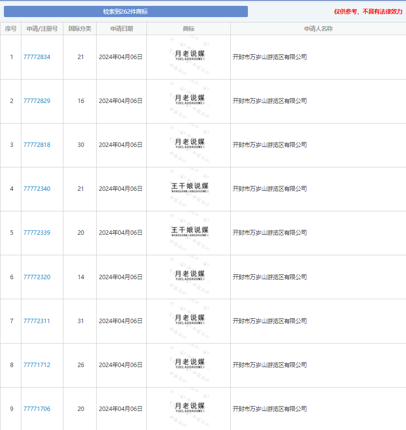 通过商标局官网查询发现,开封市万岁山游览区有限公司已经申请了“王婆说媒”“汴梁王婆说媒”“万岁山王婆说媒”“万岁山武侠城王婆说媒”等商标,