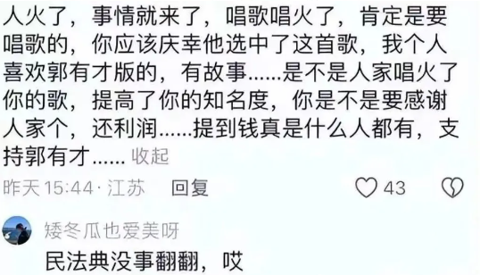 郭有才翻唱的《诺言》,原唱是台湾女歌手李翊君,最早发行于1995年1月。他靠翻唱这首歌,还有其他都不是原创的歌儿爆红后, 在直播间接受了大量打赏。他不仅接受打赏,而且还把翻唱的歌曲,制作成MV,并且没有标注原唱和词曲作者,涉嫌违法,那就必然被反噬。