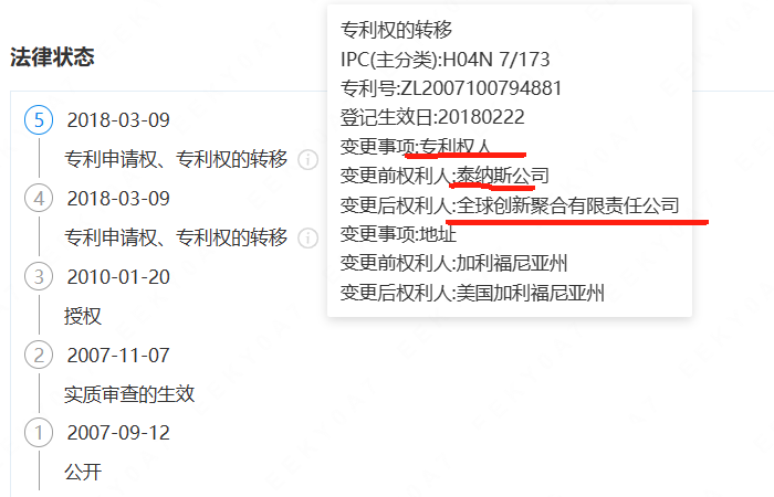 本专利通过两次变更专利权人,目前的所有者是全球创新聚合有限责任公司,是一家注册在美国的全球性专利运营公司