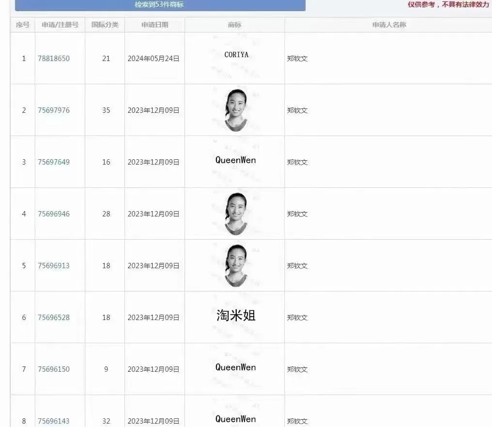 经查,以郑钦文为申请人在2023年申请多个多类商标,覆盖了服装、鞋帽、珠宝等多个领域。