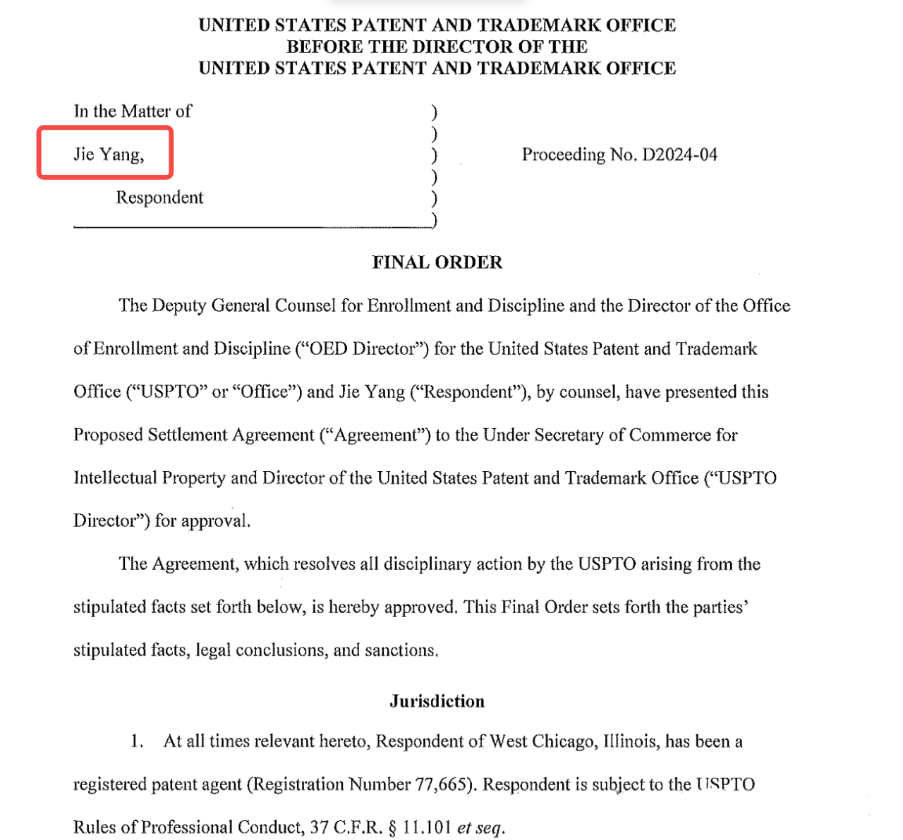 具体而言,拥有 USPTO 注册执业资格的 Jie Yang(注册号 77665)的签名被没有注册执业资格的