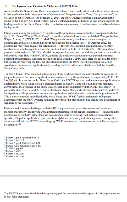 根据 USPTO 发布的最终裁决文件,近 3100 份文件因存在虚假签名的情况,违反了美国专利法规第 37 条第 1.4 项。